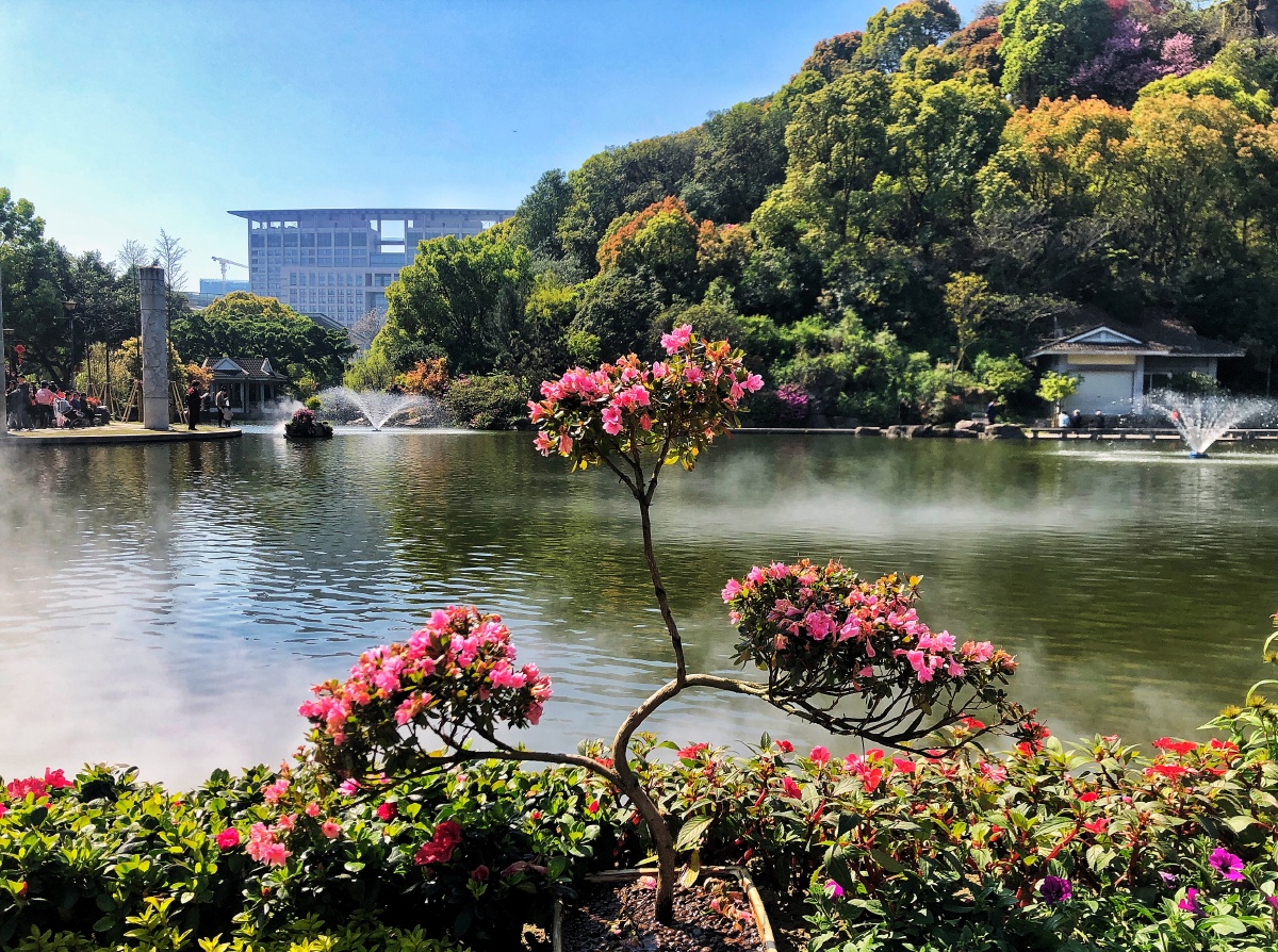 绣山公园建于2001年,南邻温州市行政管理中心,北接锦绣路,公园占地面积8.57公顷,是一处集青山、碧水、绿荫、草地为一体的自然山水休闲公园。公园充分利用原球山留下的三座小山体,改造及重构山体,通过自然曲折的水面,环绕连接三座山体,形成“一池三山”的古代江南园林布局。园内的绿化以草坪为主,乡土树种为点缀,增以杜鹃、千层金、美国红枫等季节性变化植物,并设置了花境和竹林区,注重花色花期和常绿落叶树种的搭配,使得整个公园四季如春。