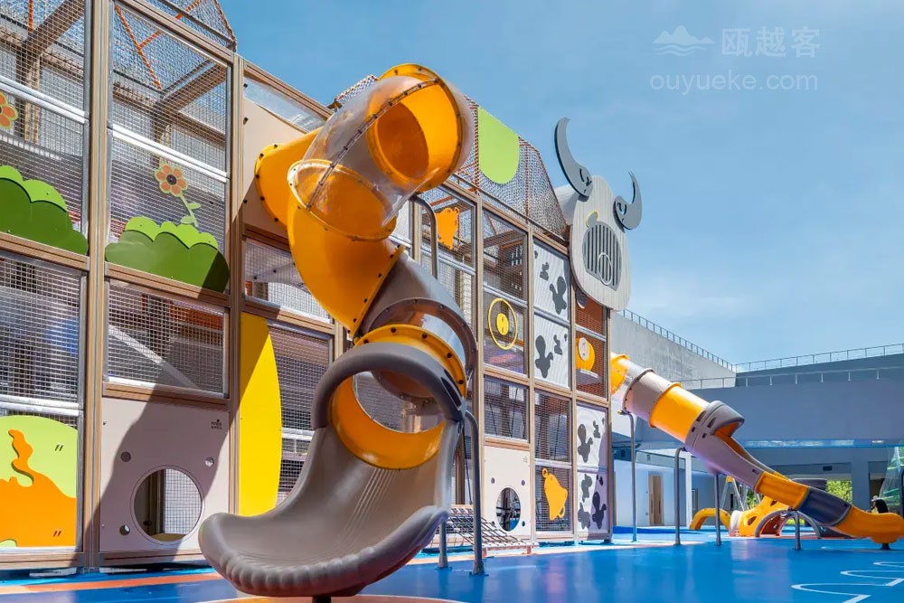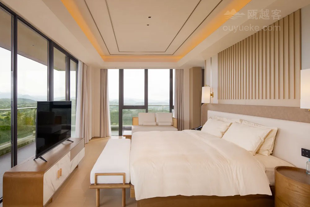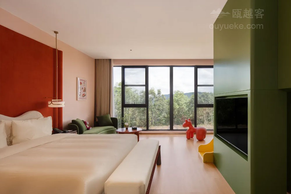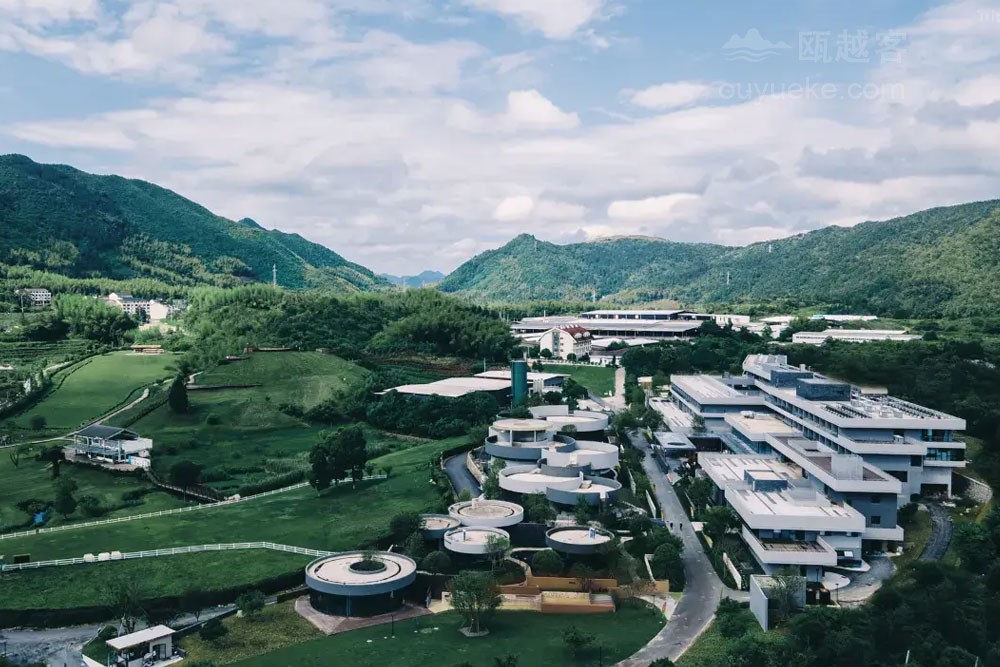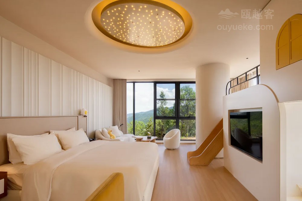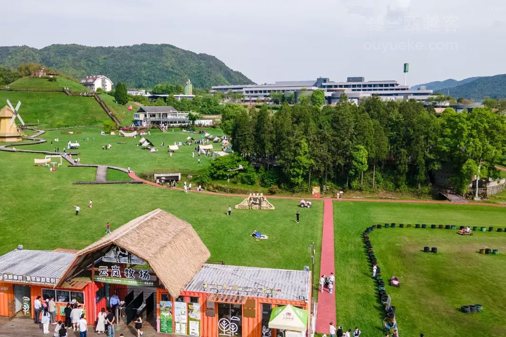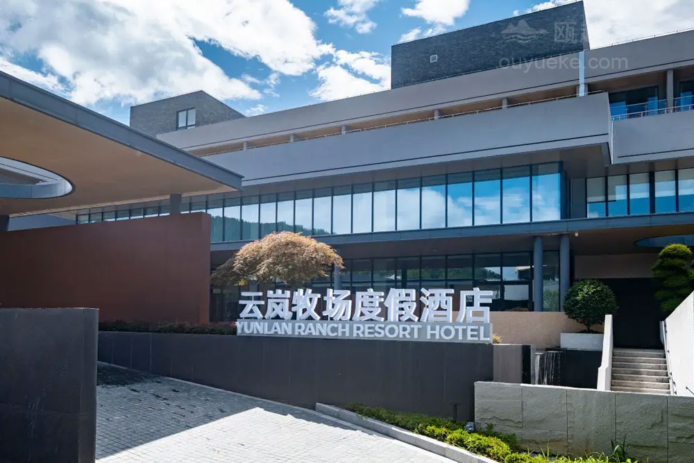云岚牧场度假品牌以“自然生活、简单快乐”为宗旨, 开创 “食宿+自然研学×亲子共创×娱乐体验×美学探索" 的一站式度假纵野。 云岚牧场度假酒店毗邻云岚牧场, 占地32.94亩,集自然野趣、奶牛文化、亲子人文于一体。酒店涵盖主题客房、“且加餐”全日制餐厅、配套餐饮包厢6间、无柱多功能宴会厅1间、会议室3间。 配套有沉浸式奶牛博物馆 (建设中)、鲜奶工坊(建设中)、旋转书吧、自然研学课堂,还有室内室外乐园、 儿童戏水池、 户外汤池、 瑜伽室及健身房等度假设施, 满足全年龄度假需求。酒店建筑运用“天人合一、 因地制宜 " 的理念,采用水平延展式布局, 建筑亦有生命和植物共同生长 , 追求建筑在自然中的 “消隐”。以原生水泥饰面与层叠片墙实现与自然景观的有机融合。 建筑设计师通过弱化建筑边界、引入流动空间概念, 让曲面墙体顺应山风轨迹, 使整体建筑犹如一片舒展的叶片, 静静栖息于群山环抱之中。