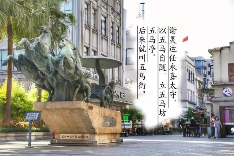 五马街,始建于东晋,至今已有1600余年历史,古称五马坊。其名字由来,根据清光绪《永嘉县志》记载:“王羲之守永嘉,庭列五马,绣鞍金勒,出则控之,故今有五马坊。”