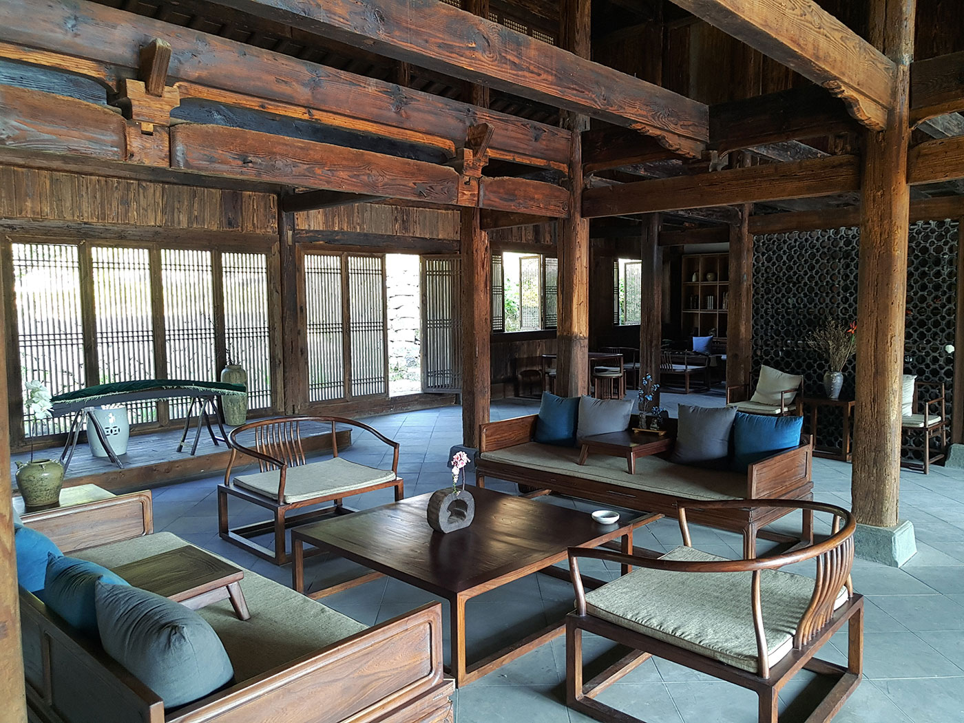 为了保护建筑形态,迷途七厝选择了旧宅改建,依托原有三或四合院式的建筑格局,可以加固的不去推翻,尽可能留住建筑和院落围合的外貌以及古朴的生活方式,屋宇檐柱修旧如旧,大部分家具也由老木打造而成。门窗结合日式推门和落地玻璃大大增加光线的自由出入,改变原先略显阴暗的氛围。