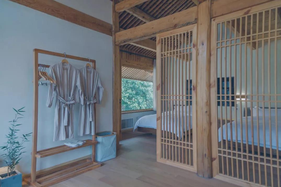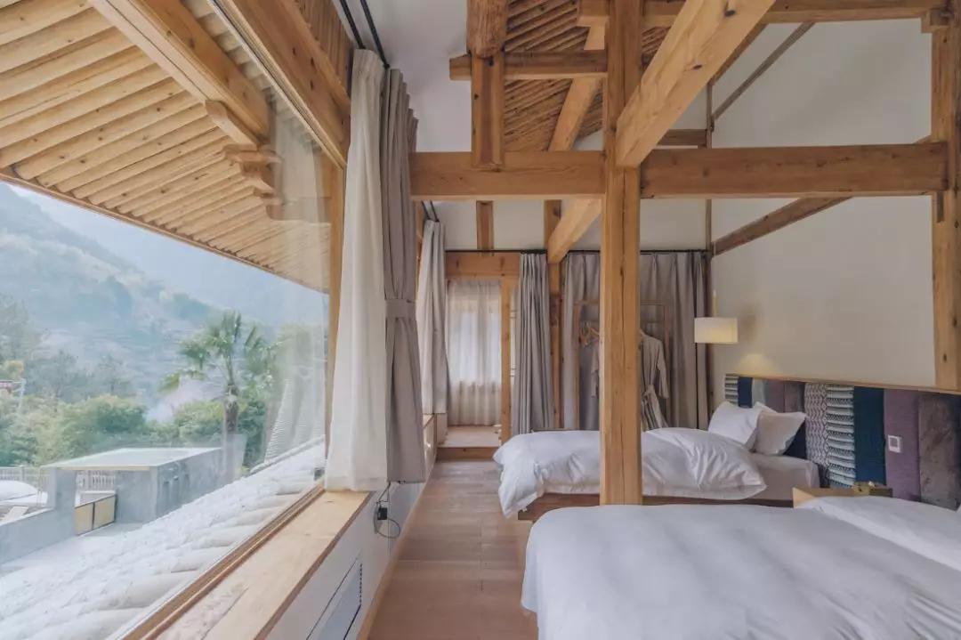 房间窗户采用大片玻璃,能补充光源的同时,还能让窗外的绿色延伸入房间。山中绿意与室内清浅木色格外搭调,每一间房间的风景都各不相同。