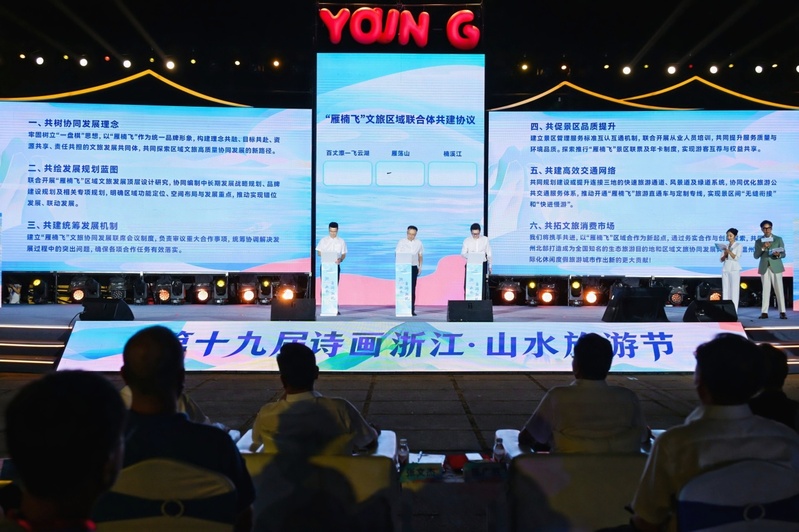 雁荡山作为本届活动的举办地,成为多项环节的焦点。现场通过视频发布了雁荡山文旅新业态,以科技赋能、深度体验与创新场景,全方位丰富产品供给,为市民游客呈上“文化+消费”“传统+潮流”的文旅盛宴。同时,“雁楠飞”文旅区域联合体共建协议签订仪式顺利举行,标志着雁荡山、楠溪江、百丈漈-飞云湖等区域协同发展迈出实质性步伐,将共同打造更具吸引力的温州文旅目的地。